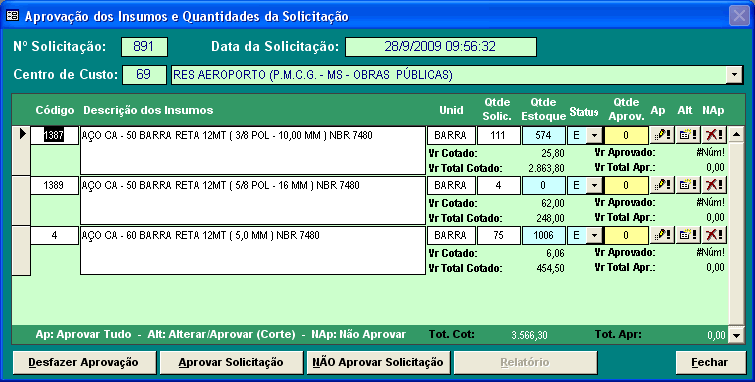 Possibilidade de realizar cotação com até 4 fornecedores que trabalham com os insumos a serem cotados. Geração do documento para cotação com possibilidade de adicionar observações. Seleciona automaticamente a melhor cotação e posteriormente alterado manualmente. Geração do Pedido de Compra, parcial ou total para um ou mais fornecedores.