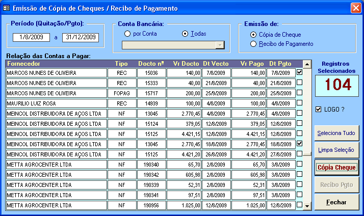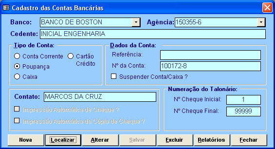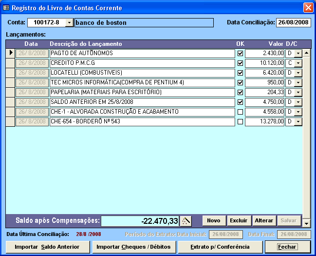 No Módulo Financeiro temos a rotina para podermos realizar a Conciliação das Contas Bancárias onde, após todos os lançamentos, teremos dois saldos: Saldo do Extrato Bancário e o Saldo Previsto onde contabilizamos todos os cheques que ainda não foram compensados. |